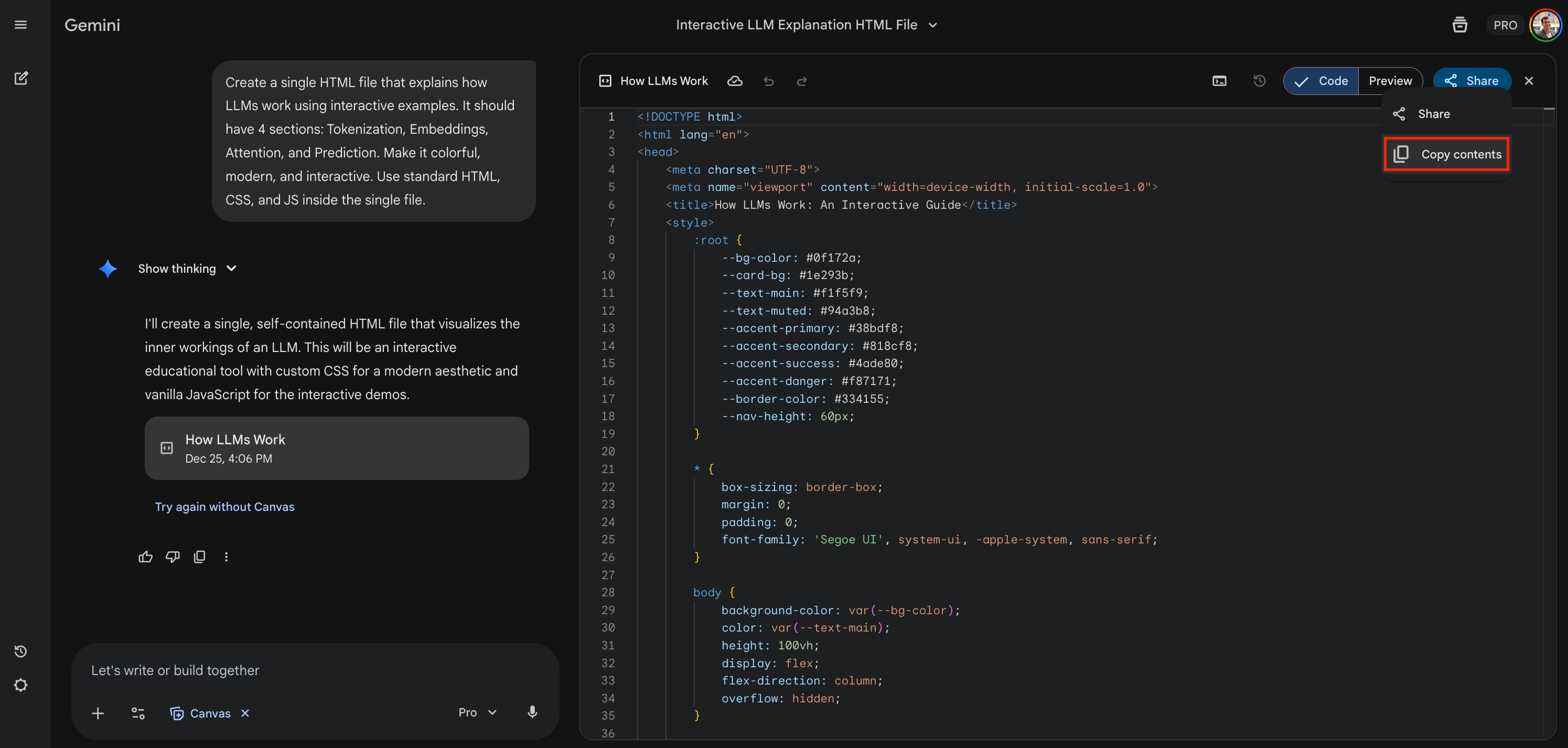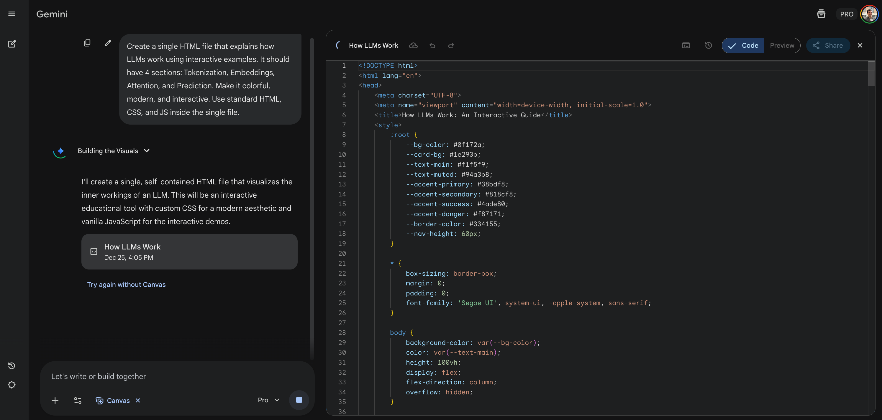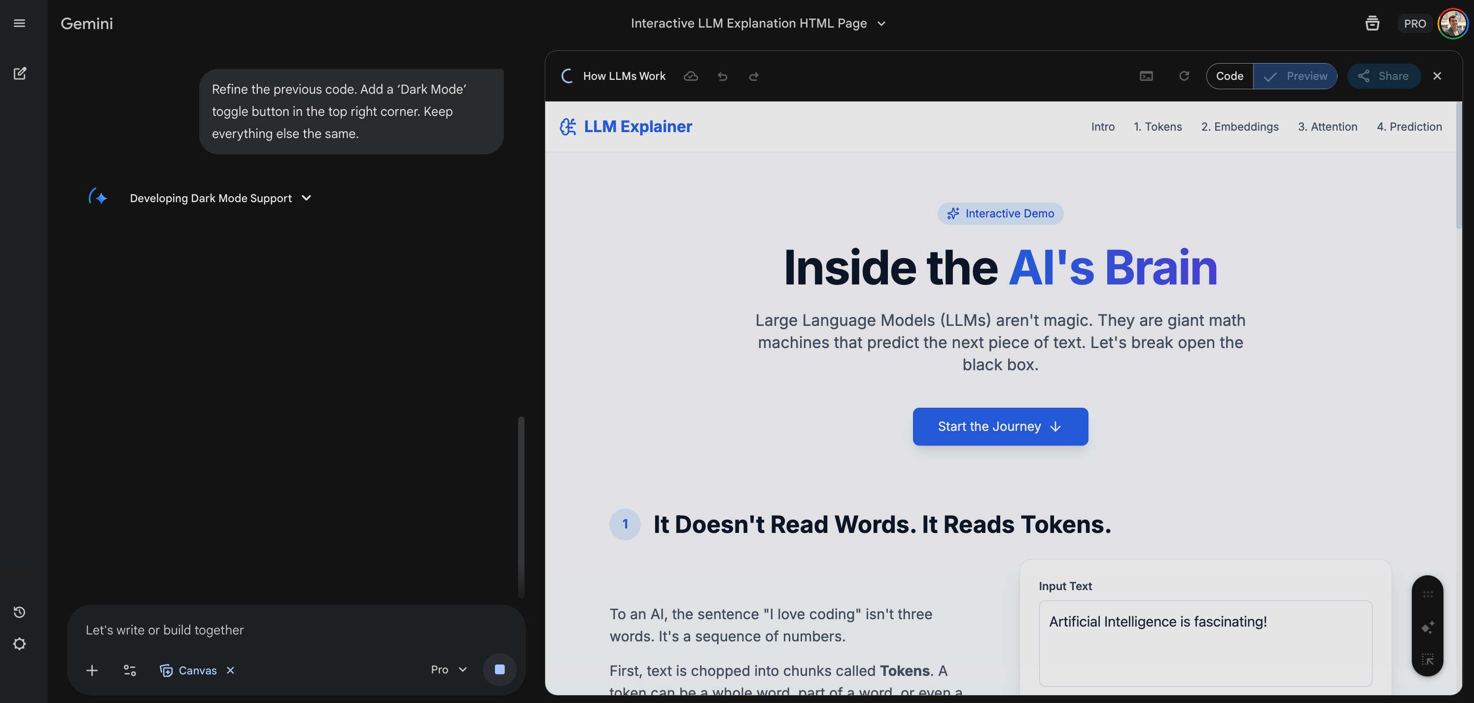 I didn’t need to know complex mathematics or JavaScript to build this. I simply asked Gemini to “build a website to explain how LLMs work with interactive examples.” The best part? The entire process, from the first prompt to the live URL, took less than 15 minutes. Personally, I now prefer creating an interactive website to explain complex ideas rather than building yet another slide deck.