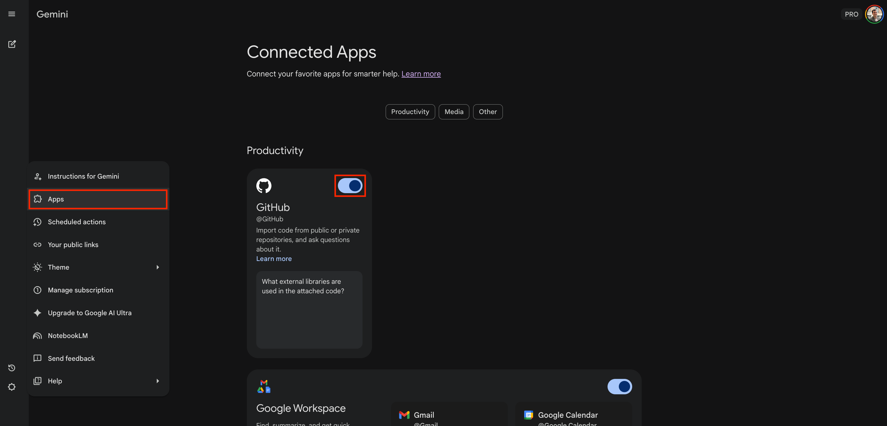 I use Gemini for the bulk of my work. Gemini creates the plan, writes the initial code, and explains things simply. It has a superpower: GitHub integration. You can connect Gemini to your GitHub account: