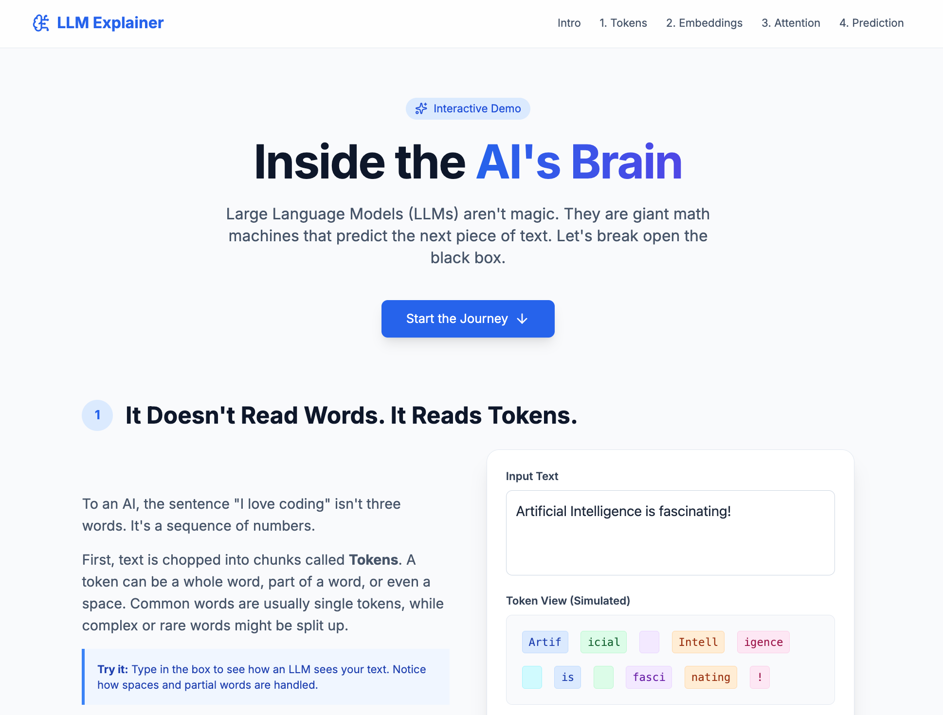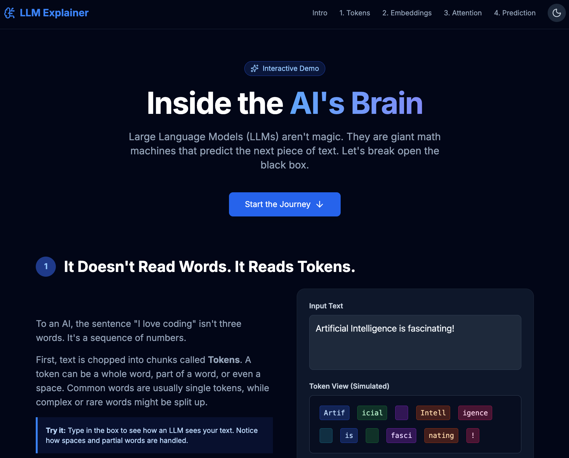 The application breaks down the black box of LLMs into four interactive steps. It starts with Tokenization, where the user can type their own text and see how the machine chops it into numbers. It moves to Embeddings, visualizing words on a 2D map where “King” and “Queen” live near each other. It demonstrates Attention, showing how an AI connects words like “animal” and “it” across a sentence. And finally, it lets you play with Prediction, using a “Temperature” slider to see how the AI decides which word comes next.