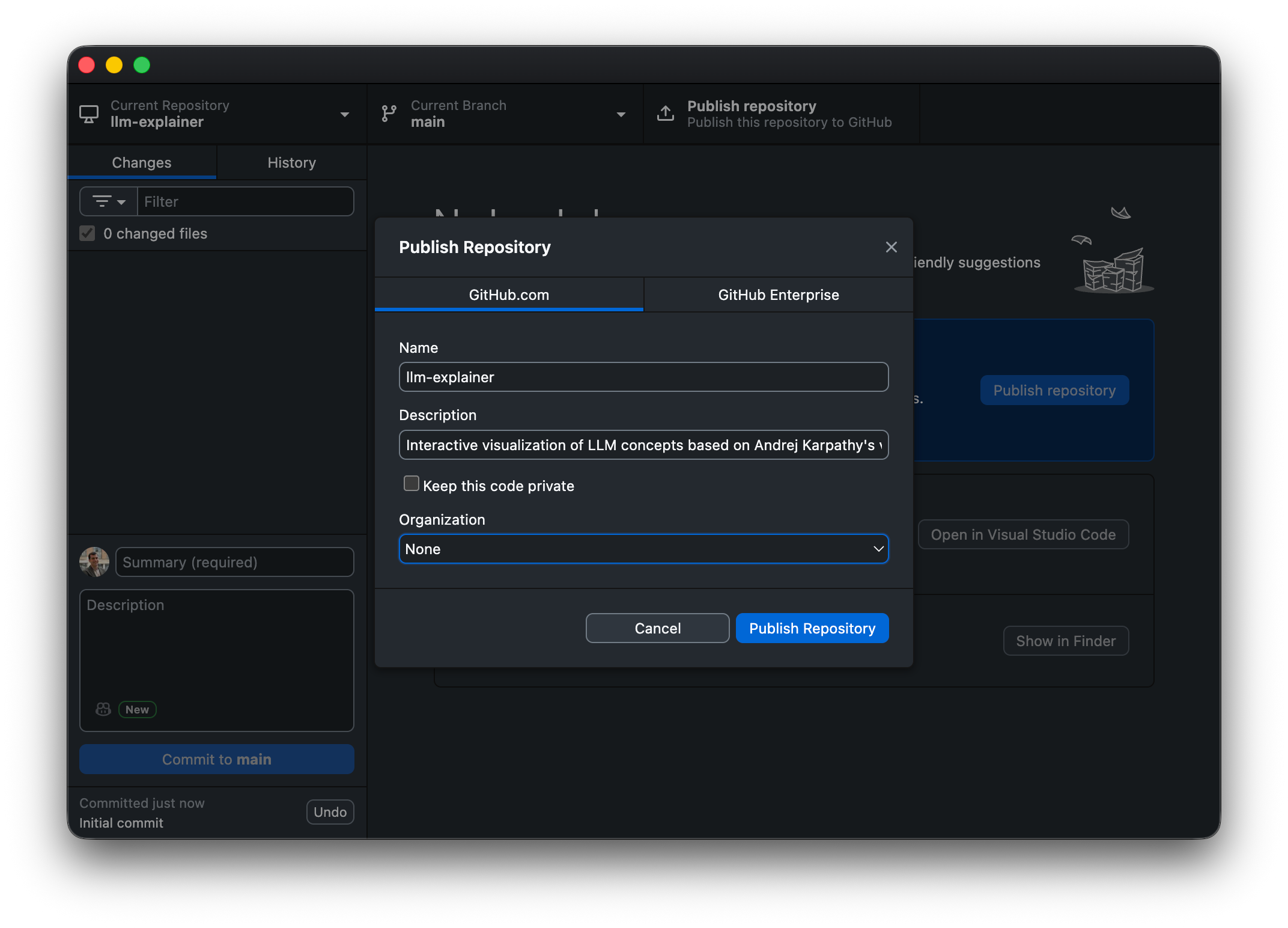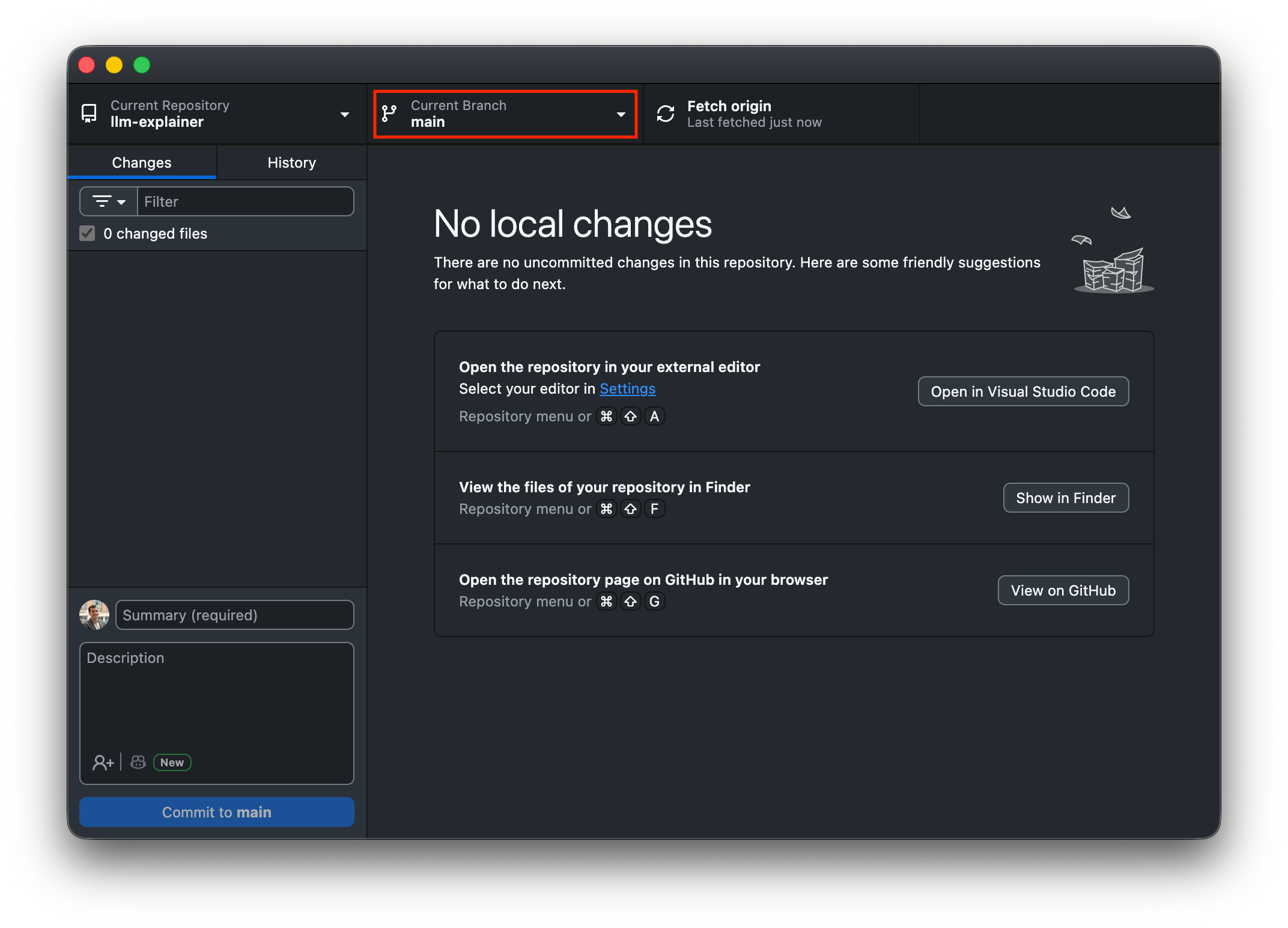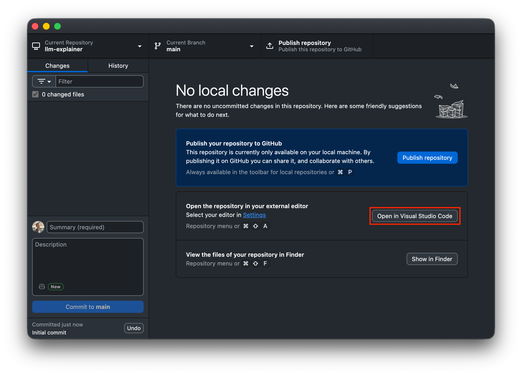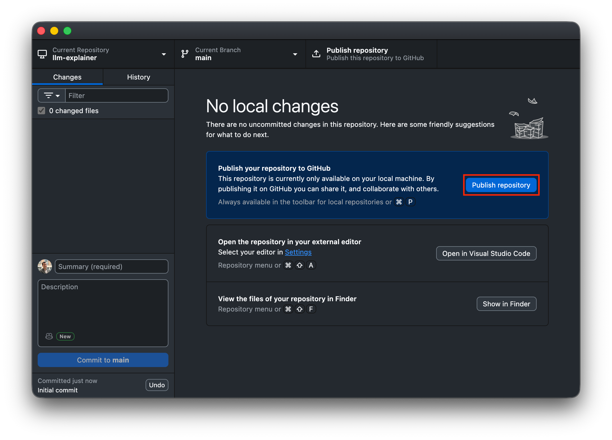 Right now, this is just an empty folder on your laptop. To verify this, click the button in GitHub Desktop that says “Show in Finder” (Mac) or “Show in Explorer” (Windows). You will see a normal folder. It’s not magic.
