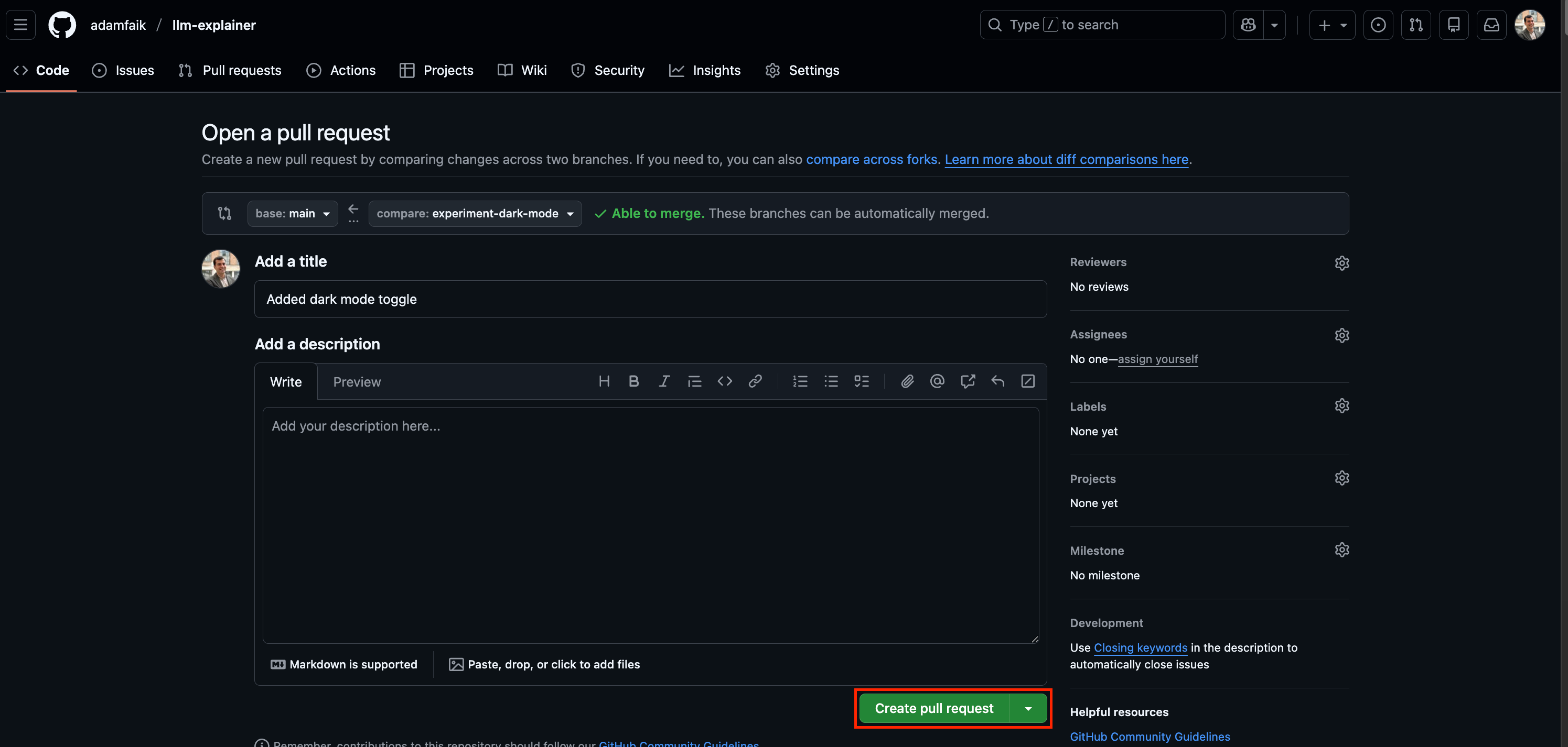 After publishing, GitHub Desktop will show a button: “Create Pull Request”. Click it.