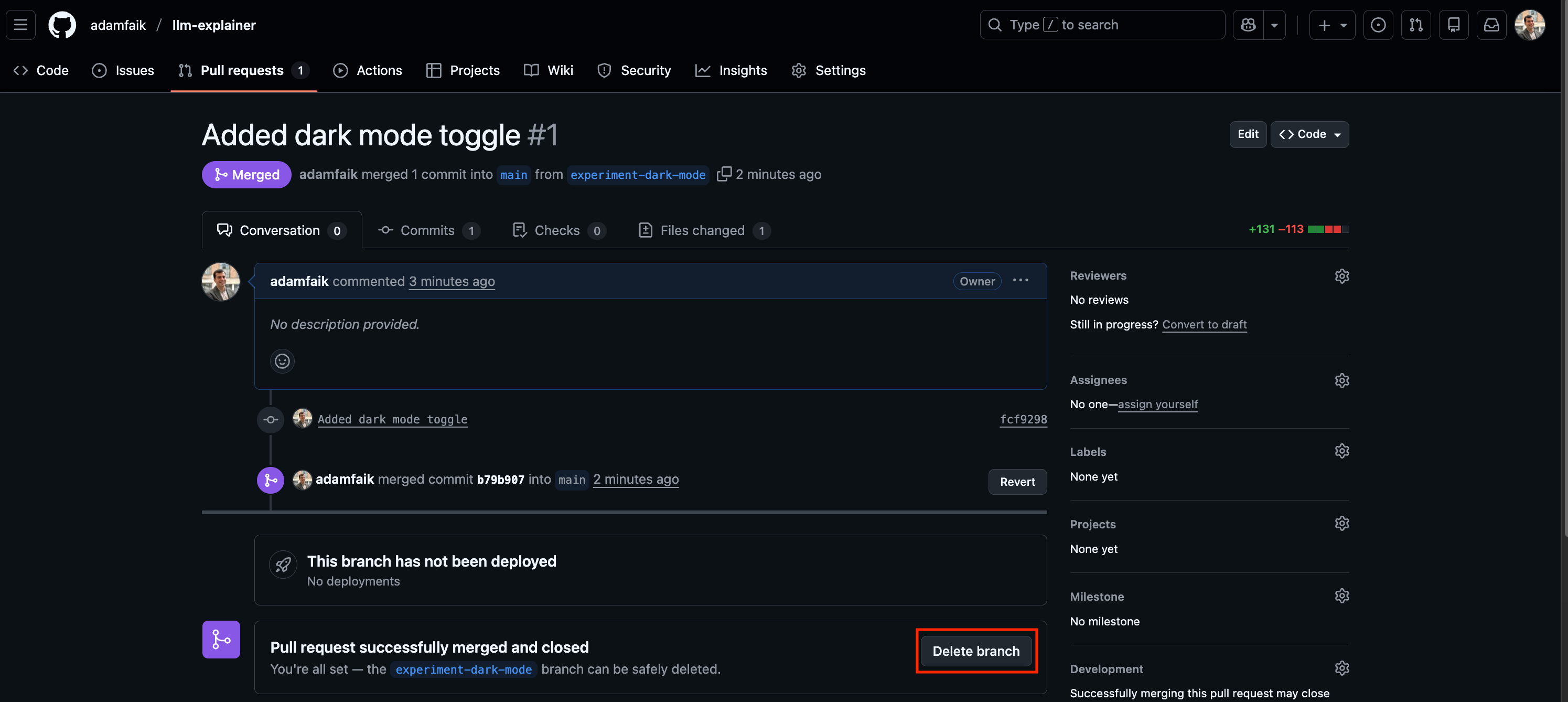 Cleanup: GitHub will ask if you want to Delete the branch. Say yes. You don’t need the experiment anymore; it’s now part of the product.