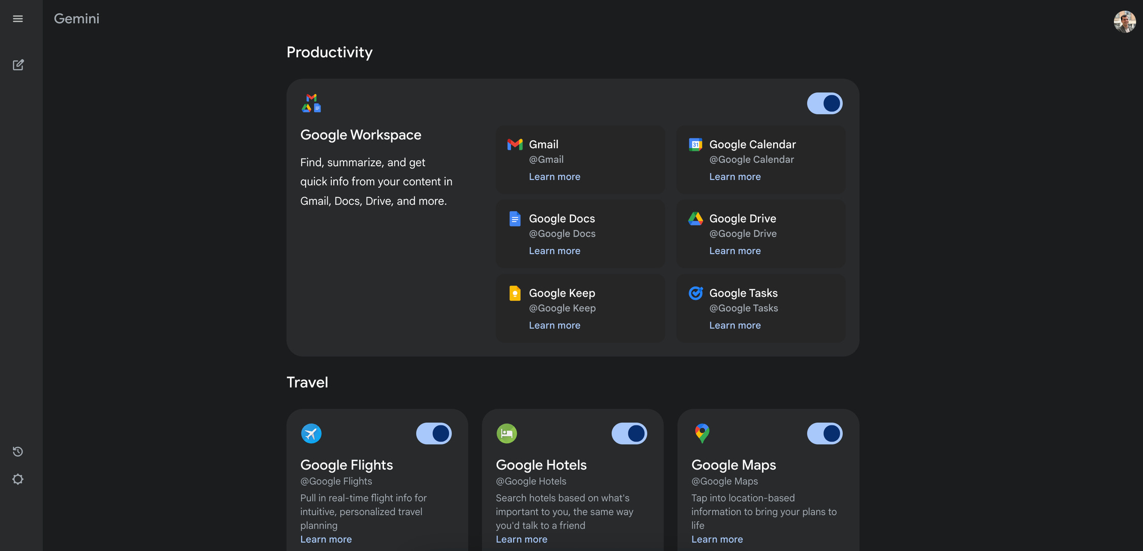 To let Gemini interact with your Google Workspace apps, enable the appropriate extensions: