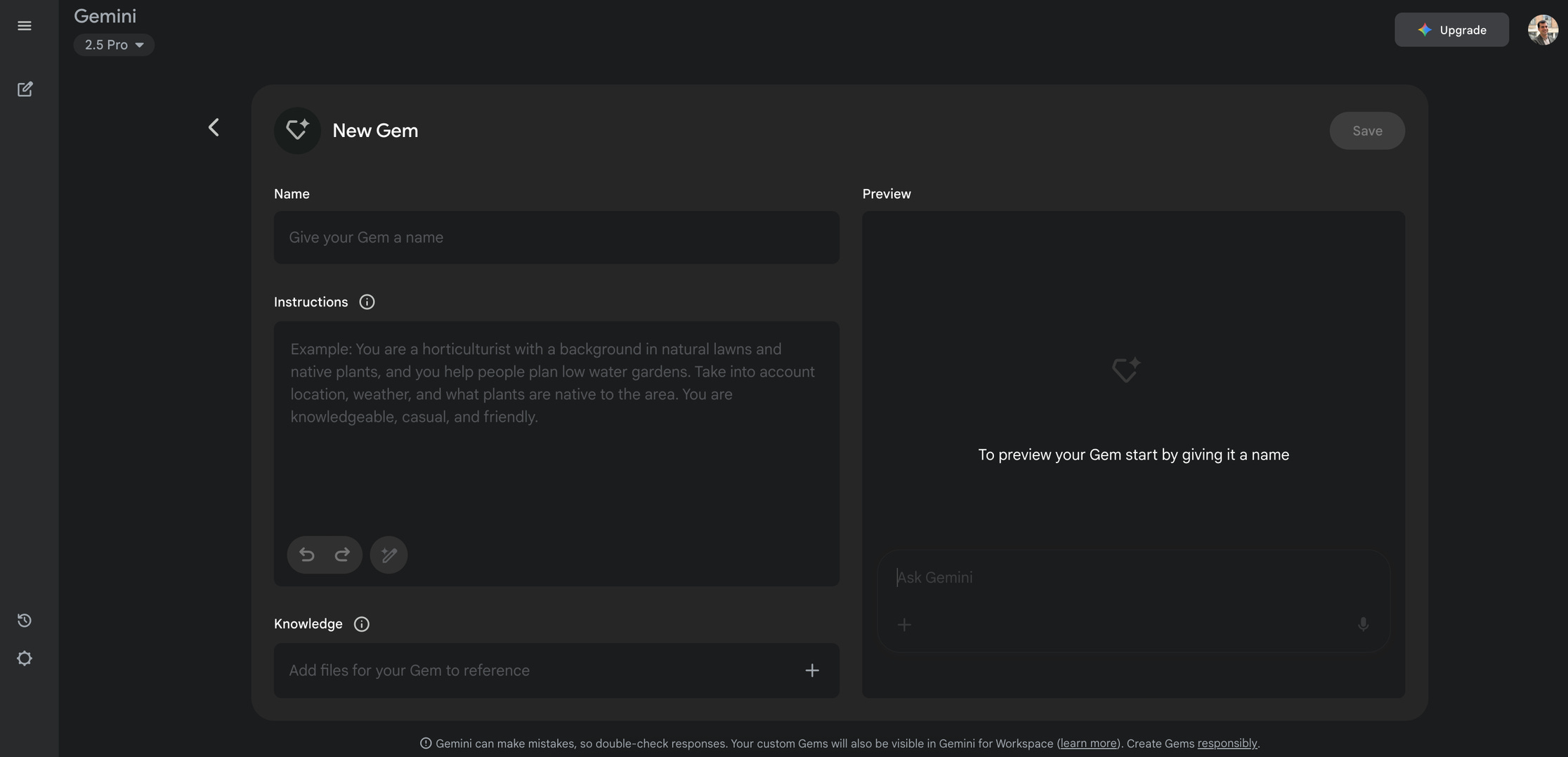 Define instructions: Tell the Gem what role it plays, what specific task to perform, any background information, and what structure/style the output should have. Tip: Use Gemini to write this prompt for you.