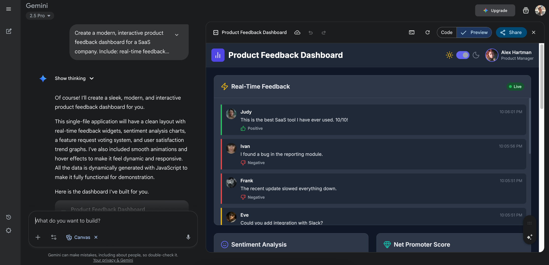 This is what I mean when I say Gemini can prototype ideas faster than you can sketch them. Beyond the LLM arena rankings, this live coding capability is where Gemini truly shines for product work.
