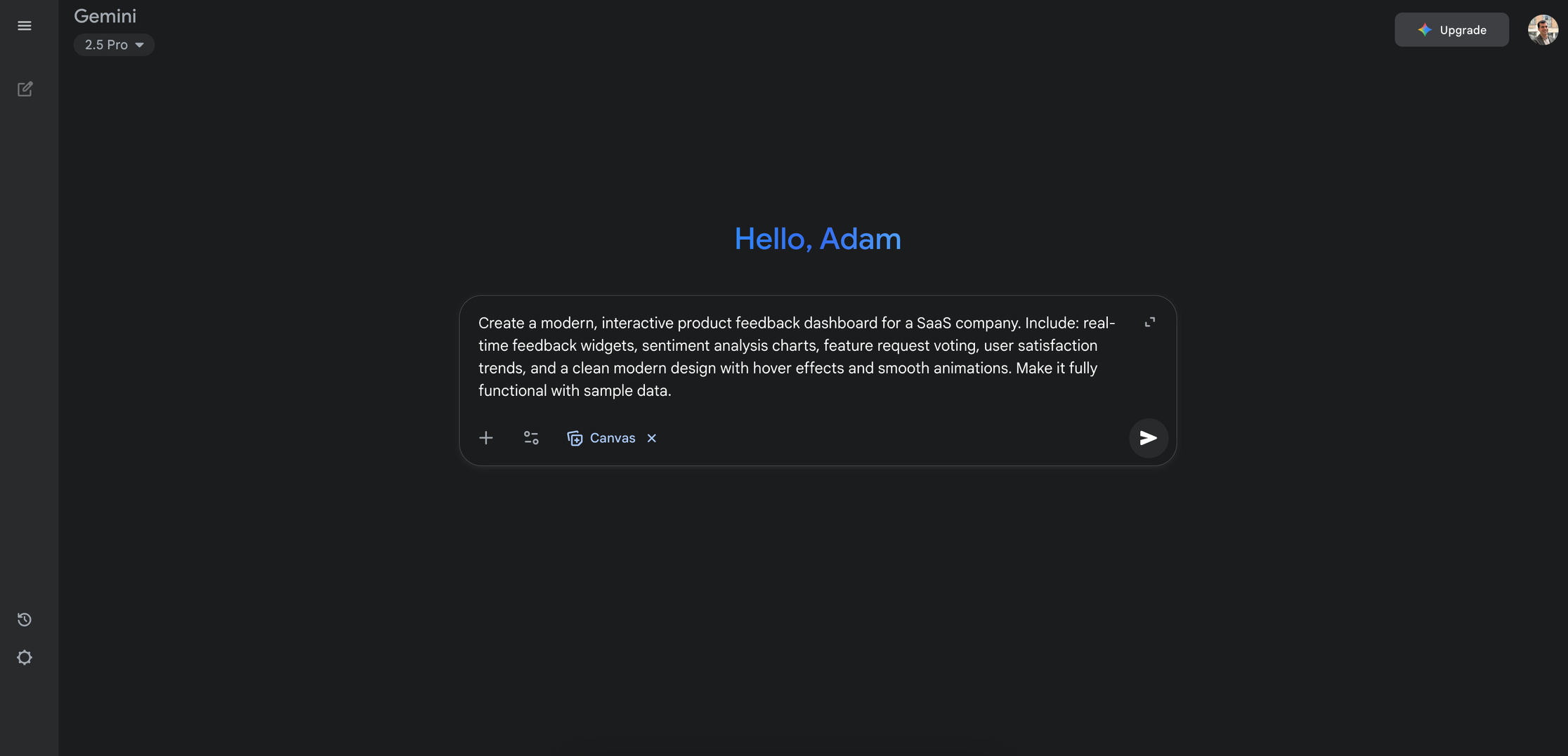 Use voice input. Enable your computer’s microphone and pace while you talk through your problem. Explain the context, the constraints, the stakeholders, everything. It feels messy, but Gemini (especially the 2.5 Pro model) excels at parsing conversational context.
